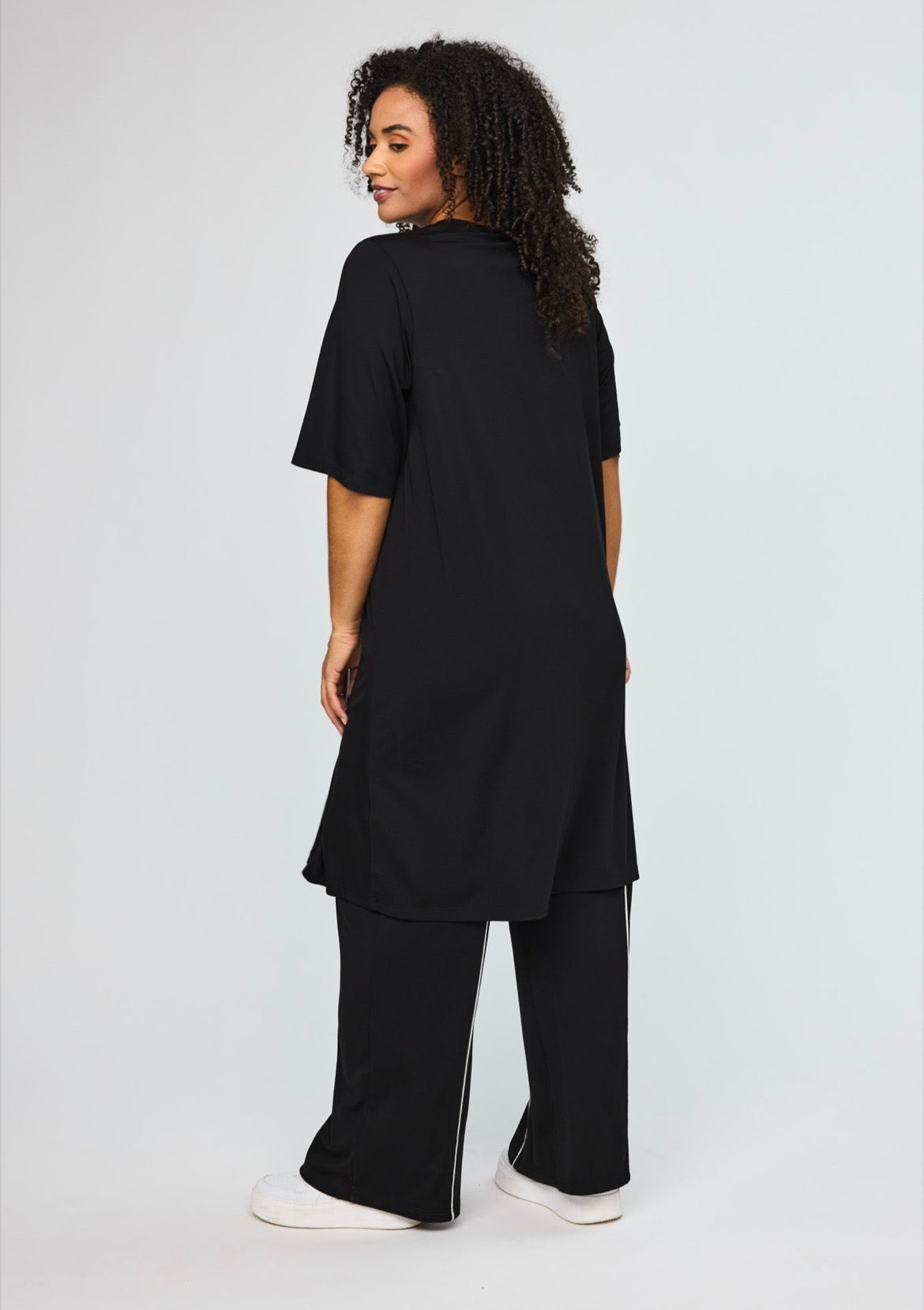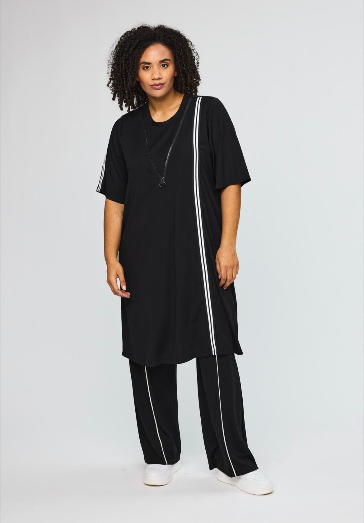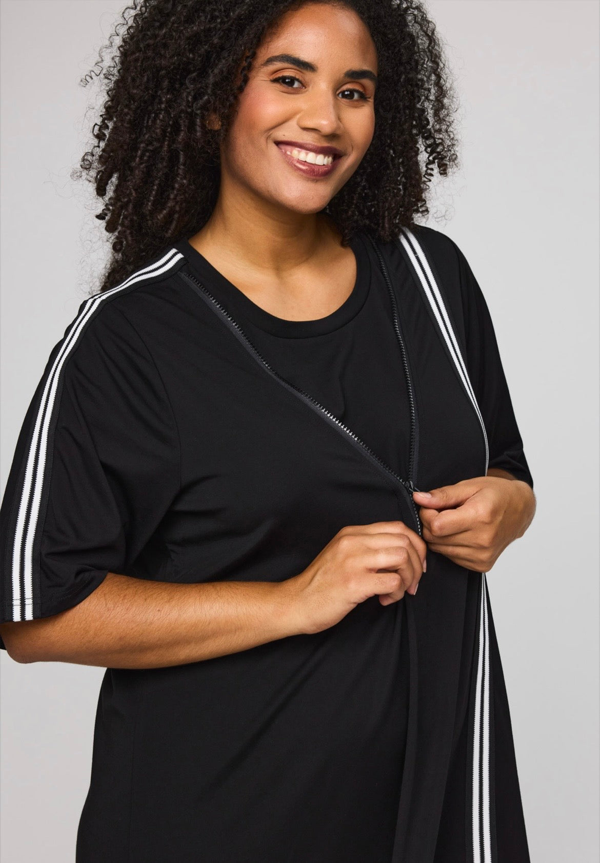 Strækbar, Viskose mix, Løs pasform, A-facon, Lynlås detalje, Rund hals, Korte ærmer og Slids foran.