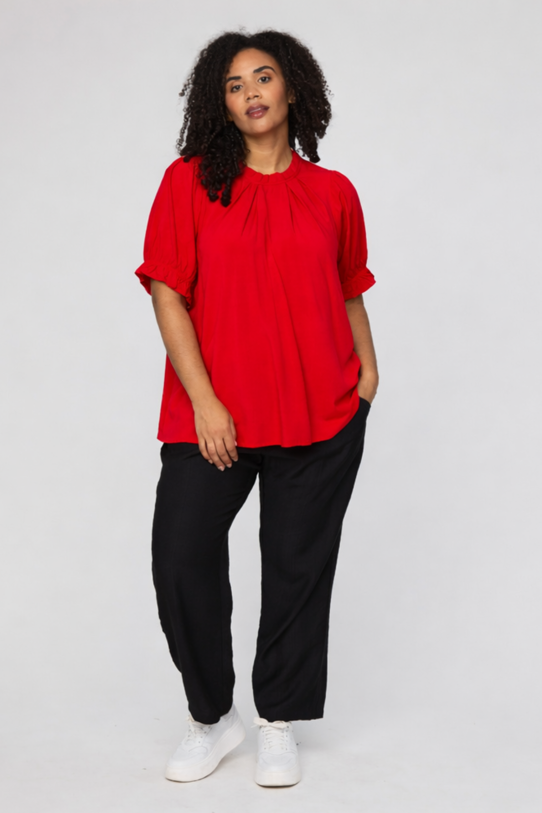 Blusan hevur flesakant um hálsin og smá leg framman. Hevur stuttar ermur við elastik, sum ger ein flesakant niðast á ermunum.