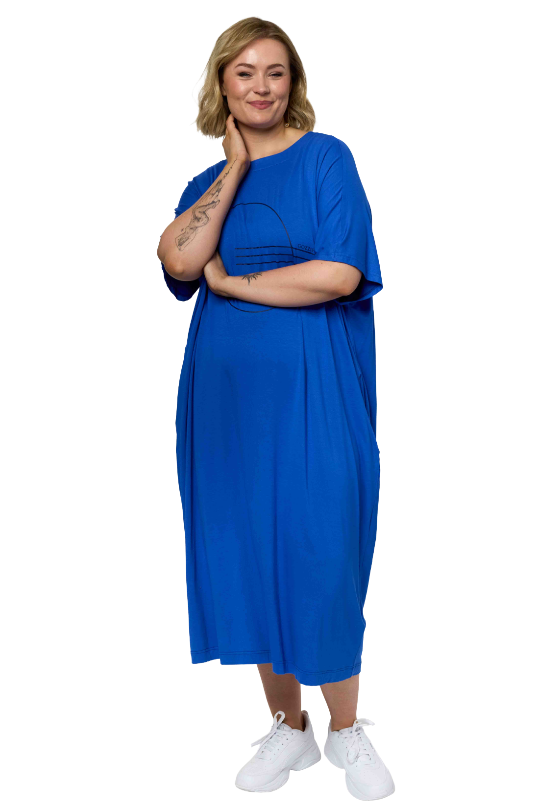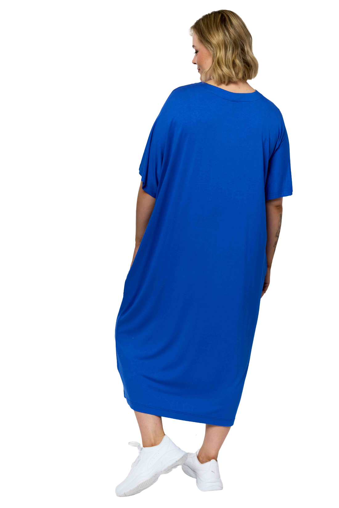 Oversize kjóli. Hevur rundan háls, stuttar ermur. Knæ longd.