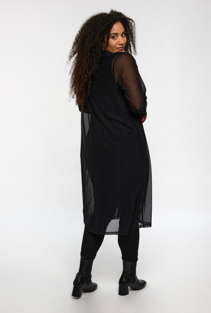 Tunn lang cardigan. Hevur flipp og bindiband framman.