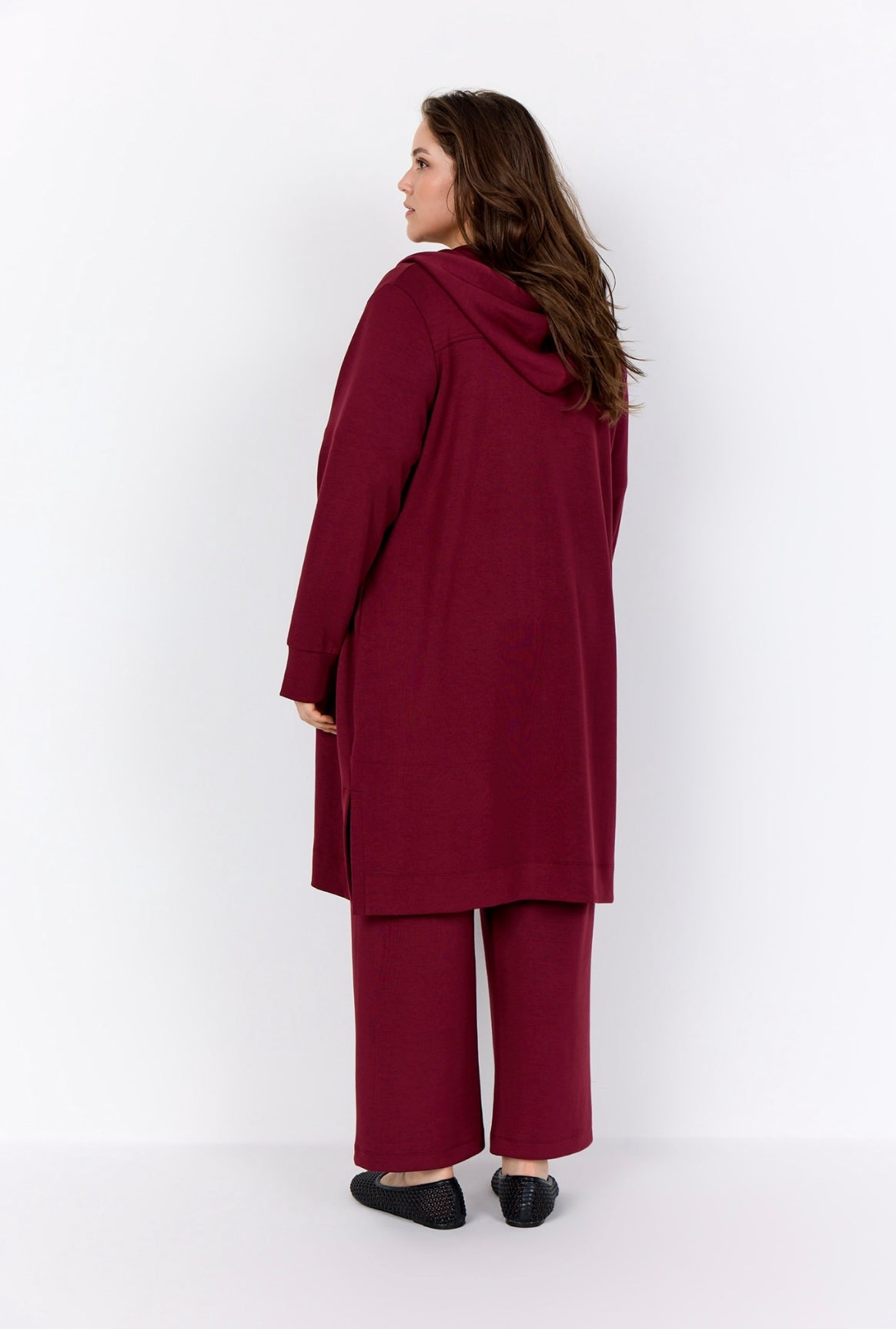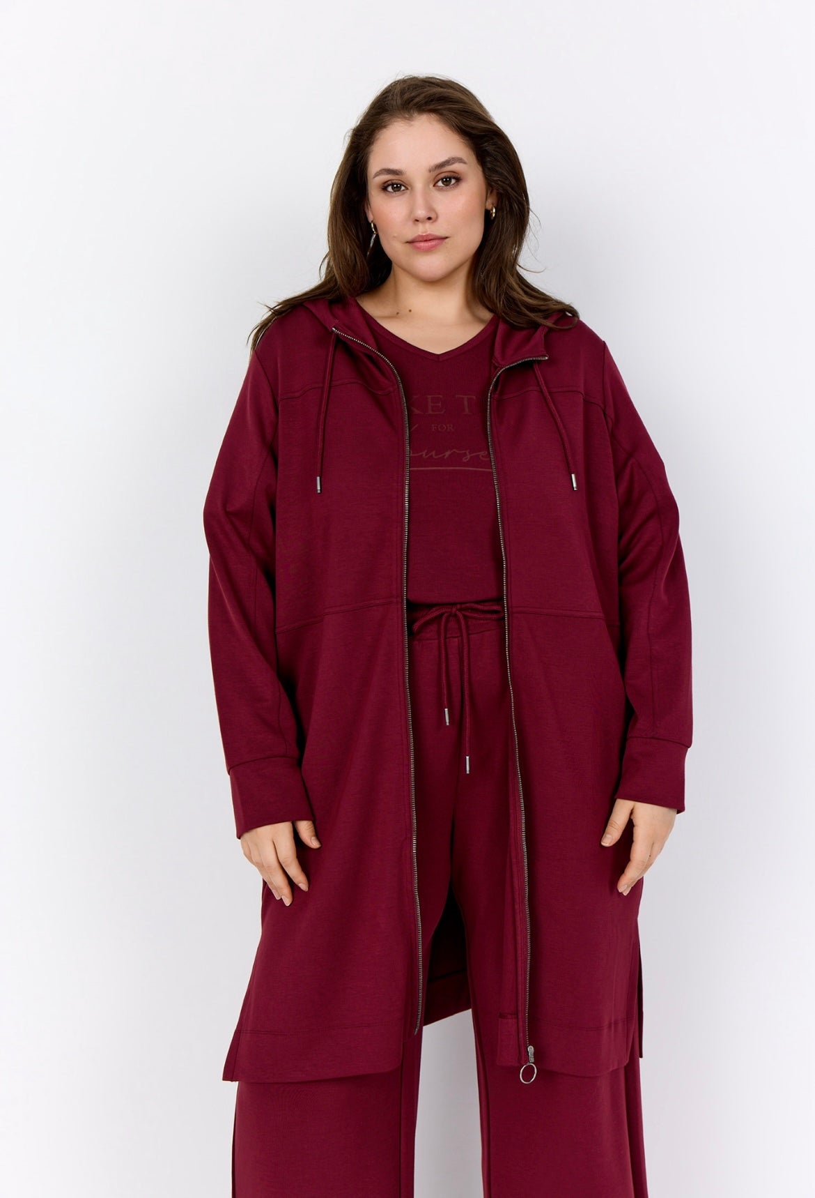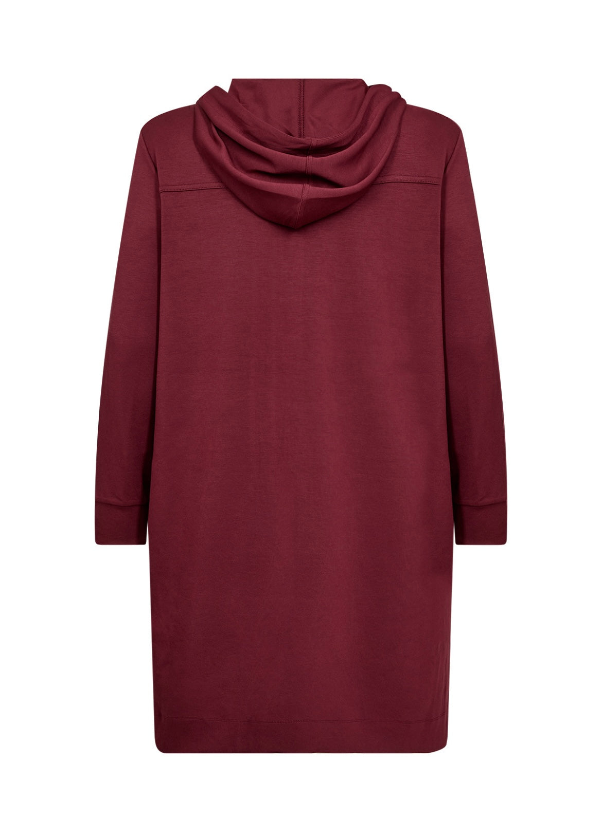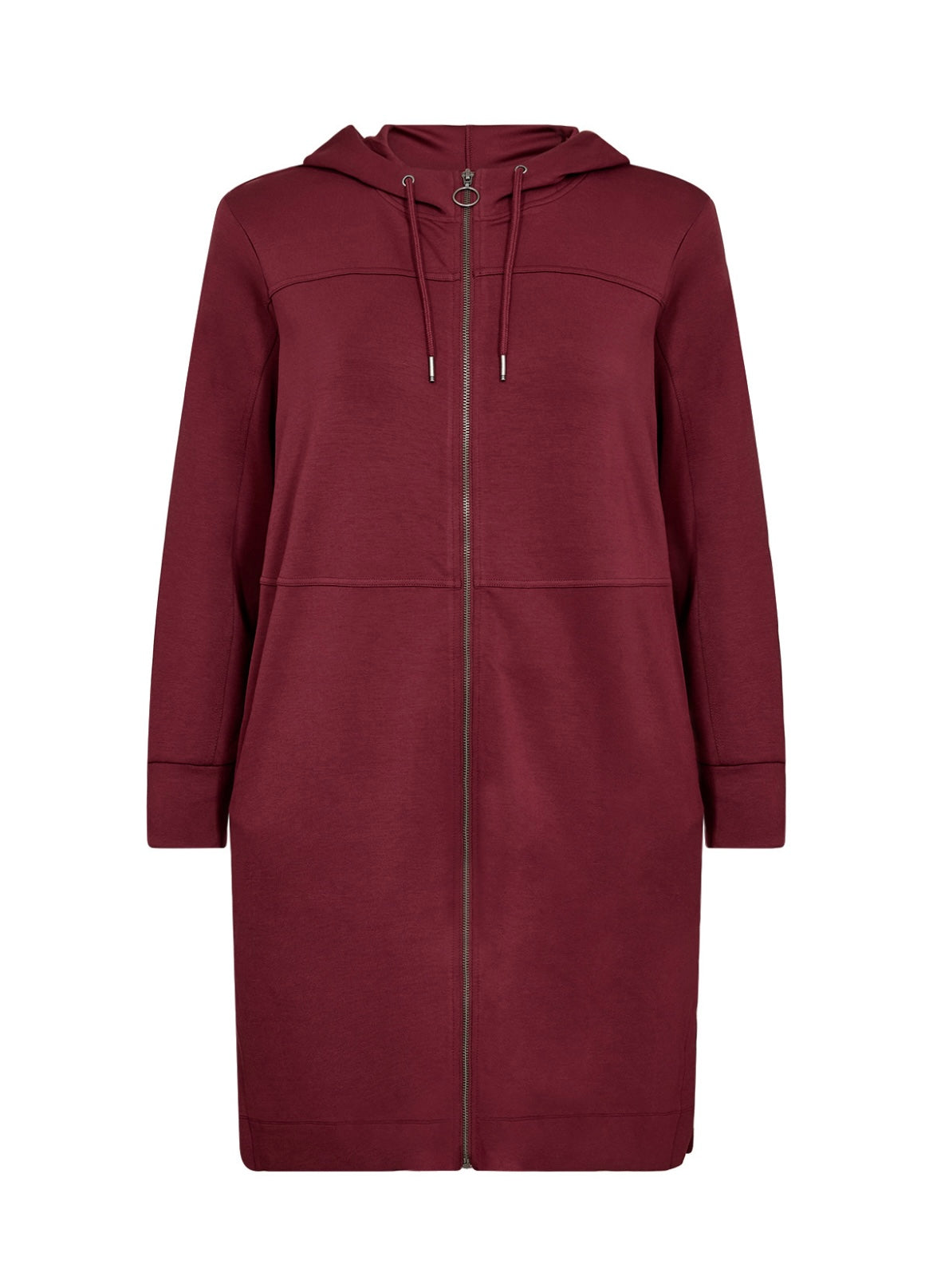 Langur jogging jakki. Hevur hettu, 2 lummar, slis í síðunum og ribrond á ermunum.